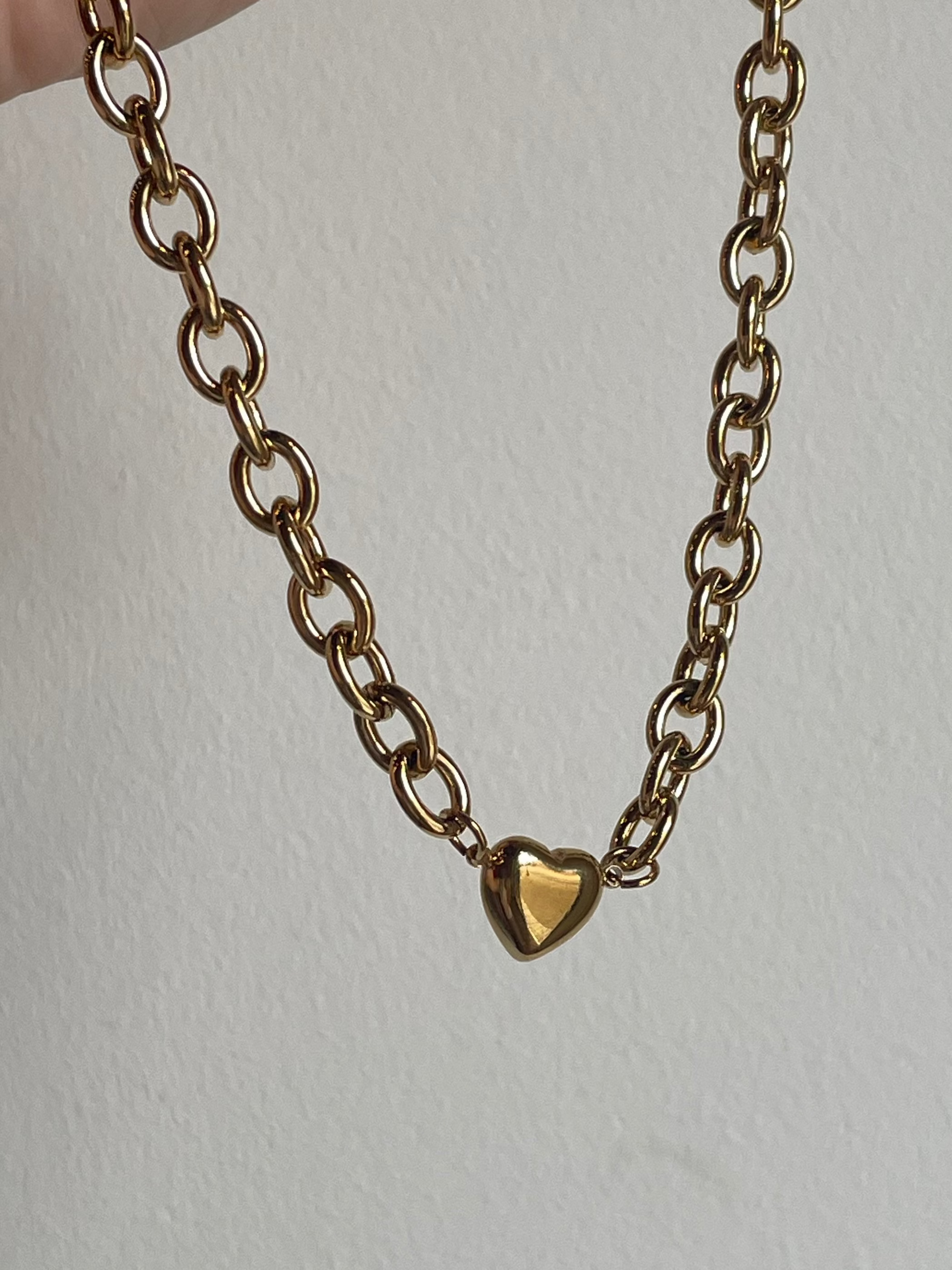 18K Stainless Steel Non-Tarnish Station of Puffy Heart with Chunky Chain Necklace, crafted from premium stainless steel with a luxurious 18K gold finish, this necklace features a bubble puffy heart pendants on a statement chain. The non-tarnish properties ensure that your necklace maintains its luster and brilliance for years to come.