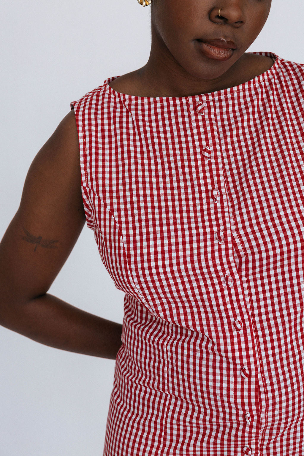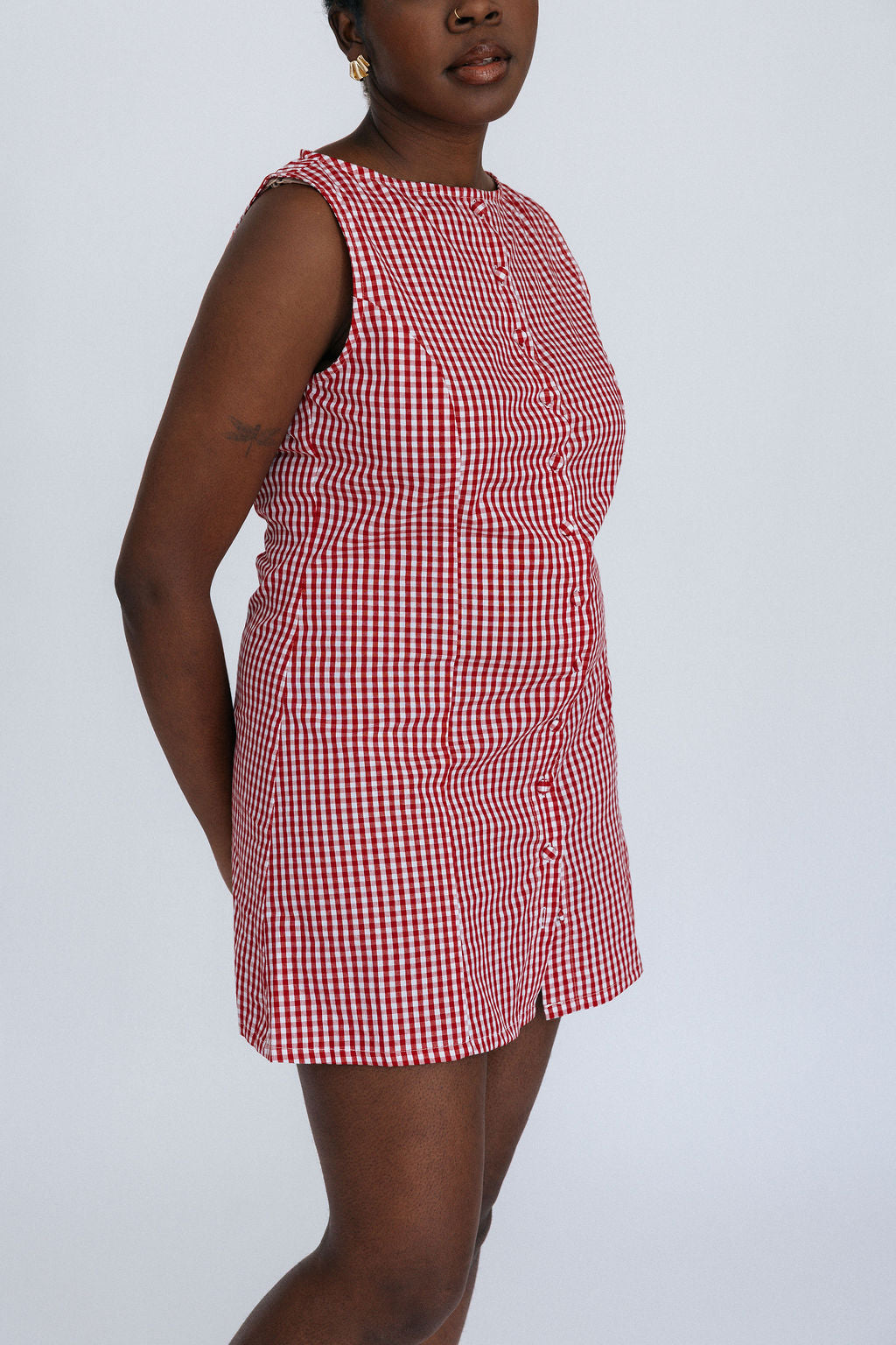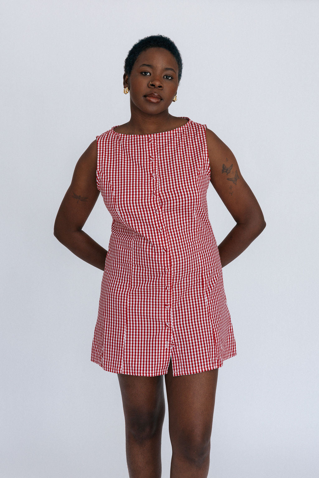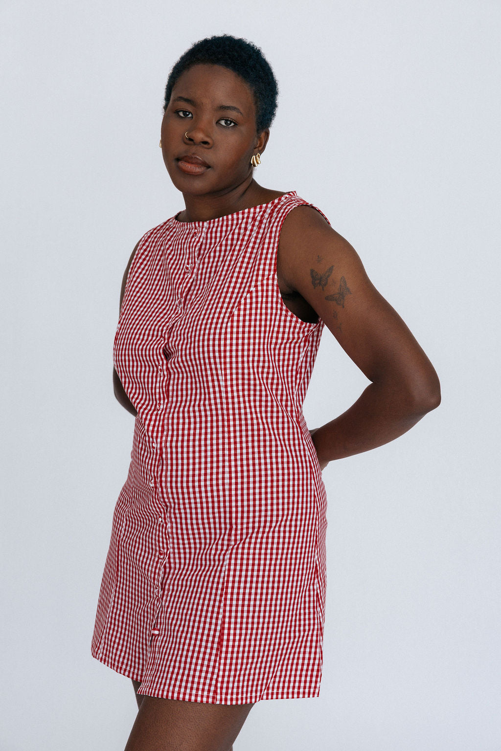 Add a little 60's sillhouette to your wardrobe. This 100% cotton dress has fabric covered buttons, a boatneck neckline, and little flair to the skirt. Comfortable and durable, the Bridgett Dress is perfect for farmer's market saturdays or fall gamedays.