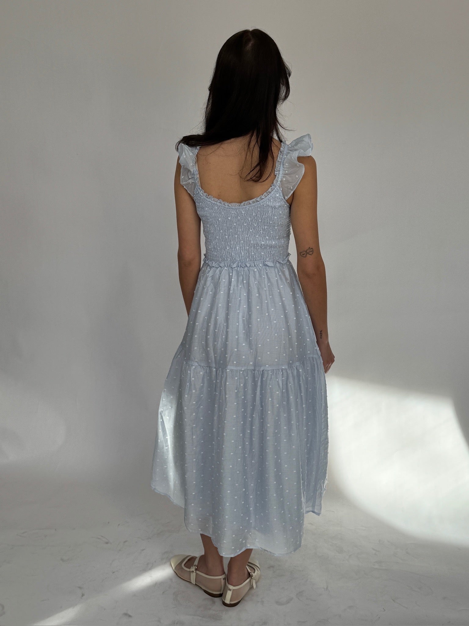 The sweetest dotted chiffon dress with ruffle and bow details. The perfect light blue.