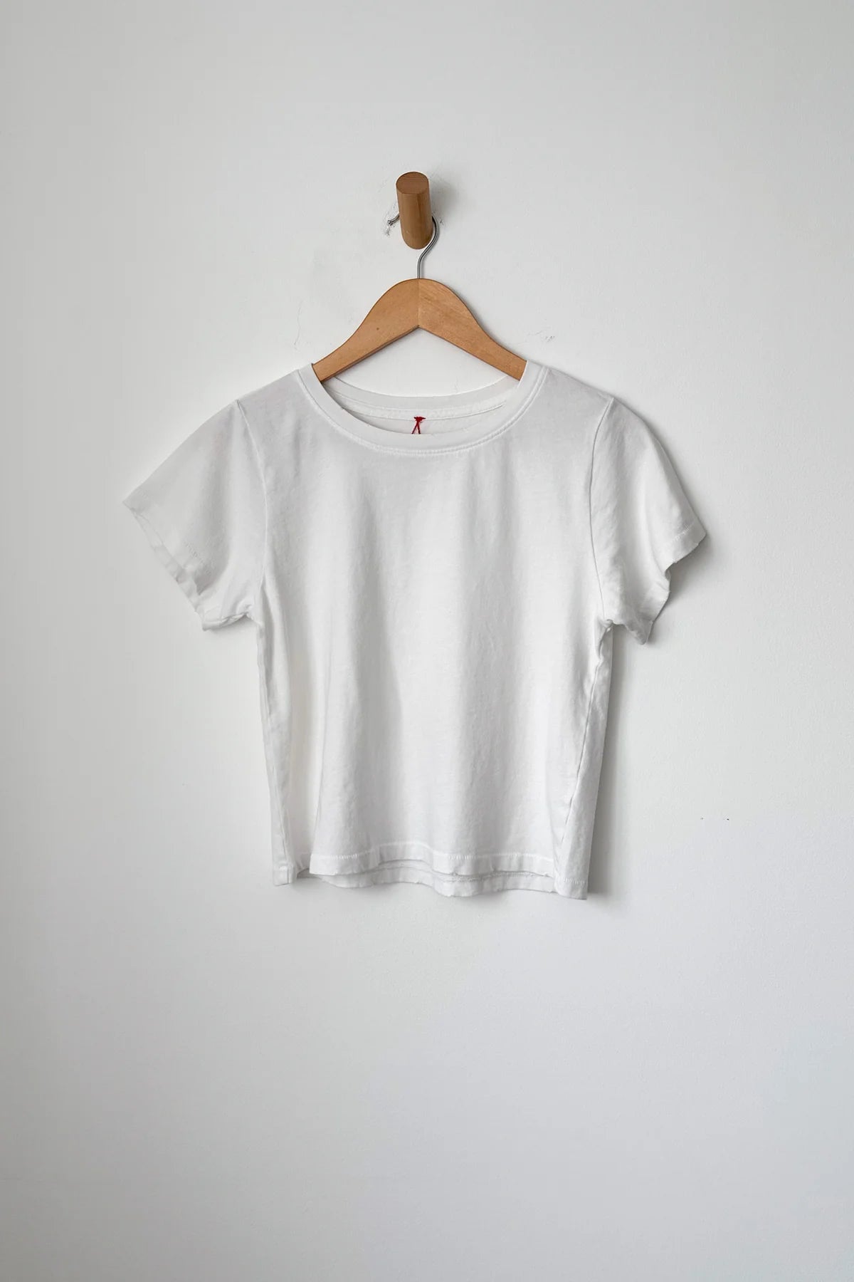 Meet the Darling Tee — It strikes the ideal balance between The Little Boy Tee's fit and the Vintage Boy Tee's worn-in charm. Featuring a relaxed boxy silhouette that hits the perfect waist length, it offers gently distressed details and a 90's fade for a true vintage allure. Crafted from locally sourced cotton, this low gauge knit tee combines a light, airy feel with a beautifully structured yet soft touch, giving you the vintage feel you long for.