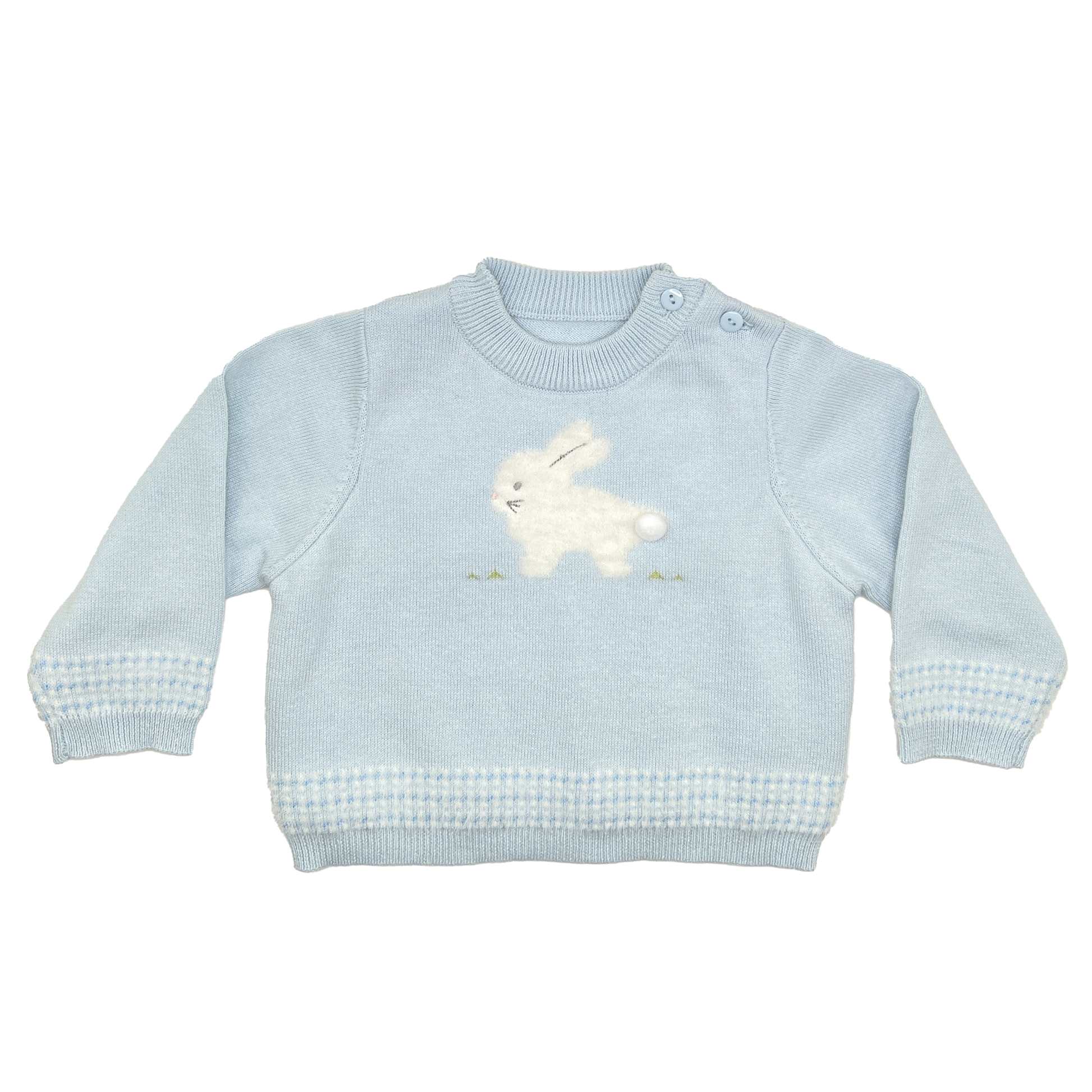 Delicate and soft, this lightweight bunny knit sweater is simply precious! This fine gauge fuzzy bunny knit sweater is made using all natural 100% cotton yarns and eco-friendly dyes making a soft and elegant sweater that any child is sure to love. Our lightweight knit sweater features jacquard fuzzy bunny with a puff ball tail on the front with jacquard patterned trim and is machine washable for easy care! Made with 100% cotton yarns and Eco-Friendly dyes