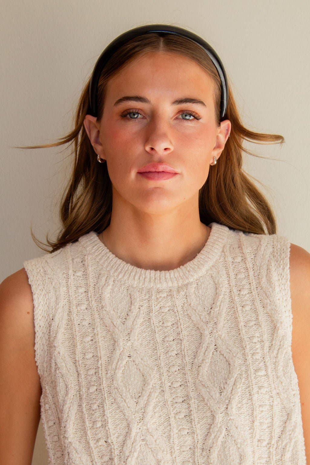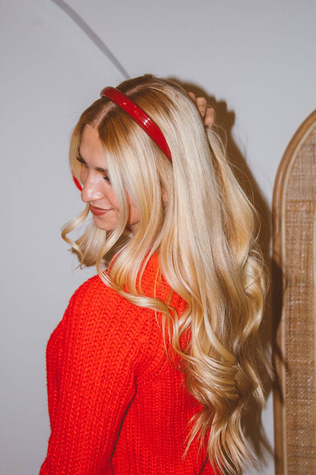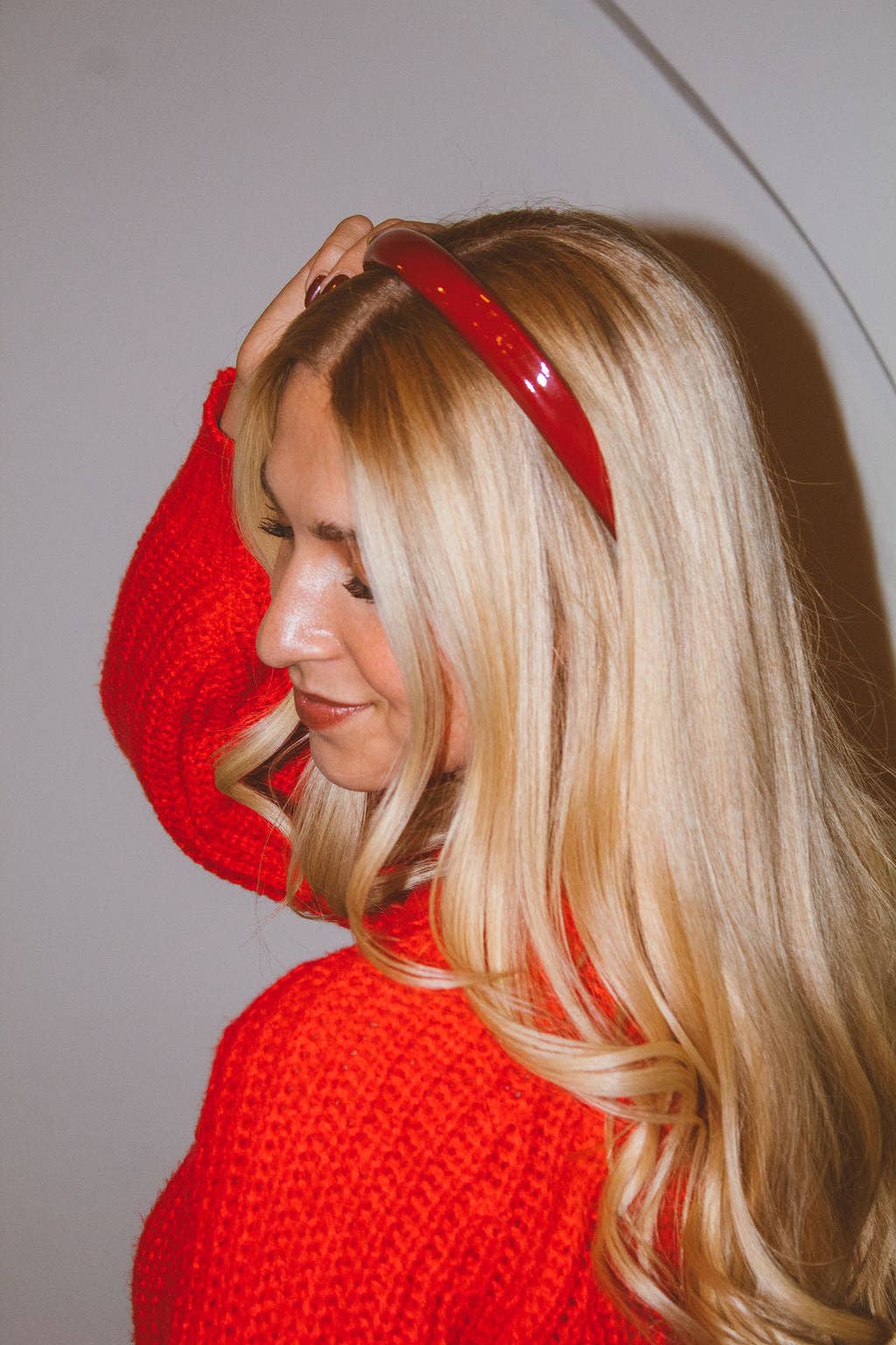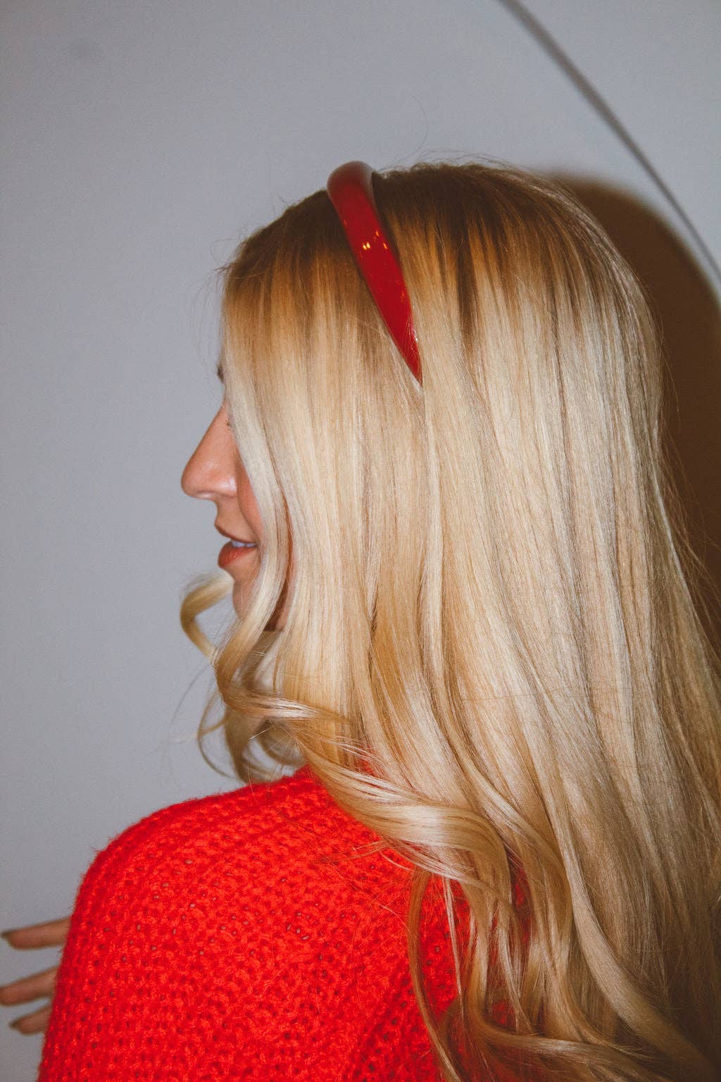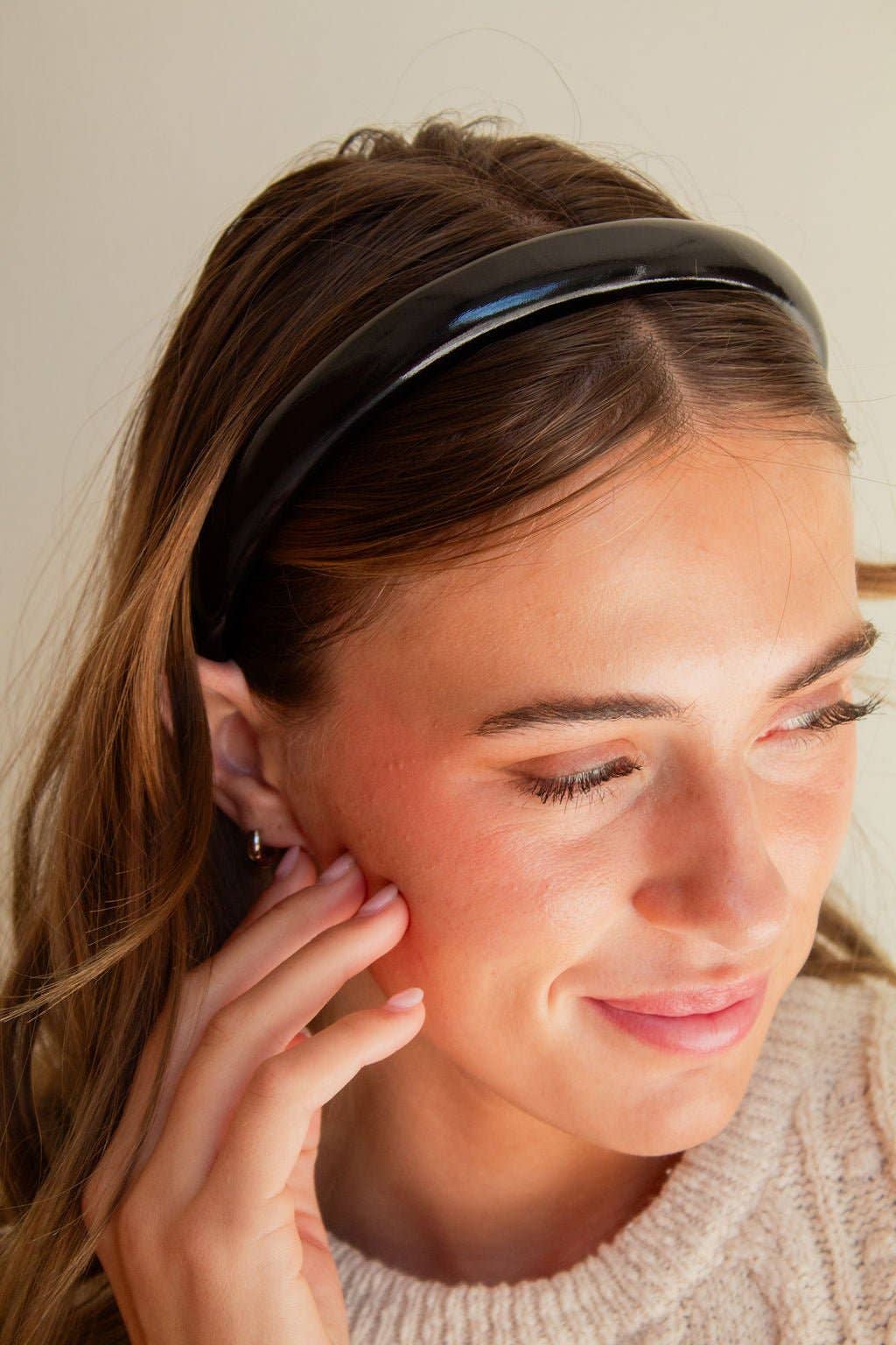 This headband is to die for! This headband is a thick, padded design on a hard band. Made with a glossy faux leather fabric that comes in red and black, it will effortlessly match any vibe and any occasion. Match this headband with a chill, stay-at-home, outfit; pair it with a fancy date night dress, and anything in between.