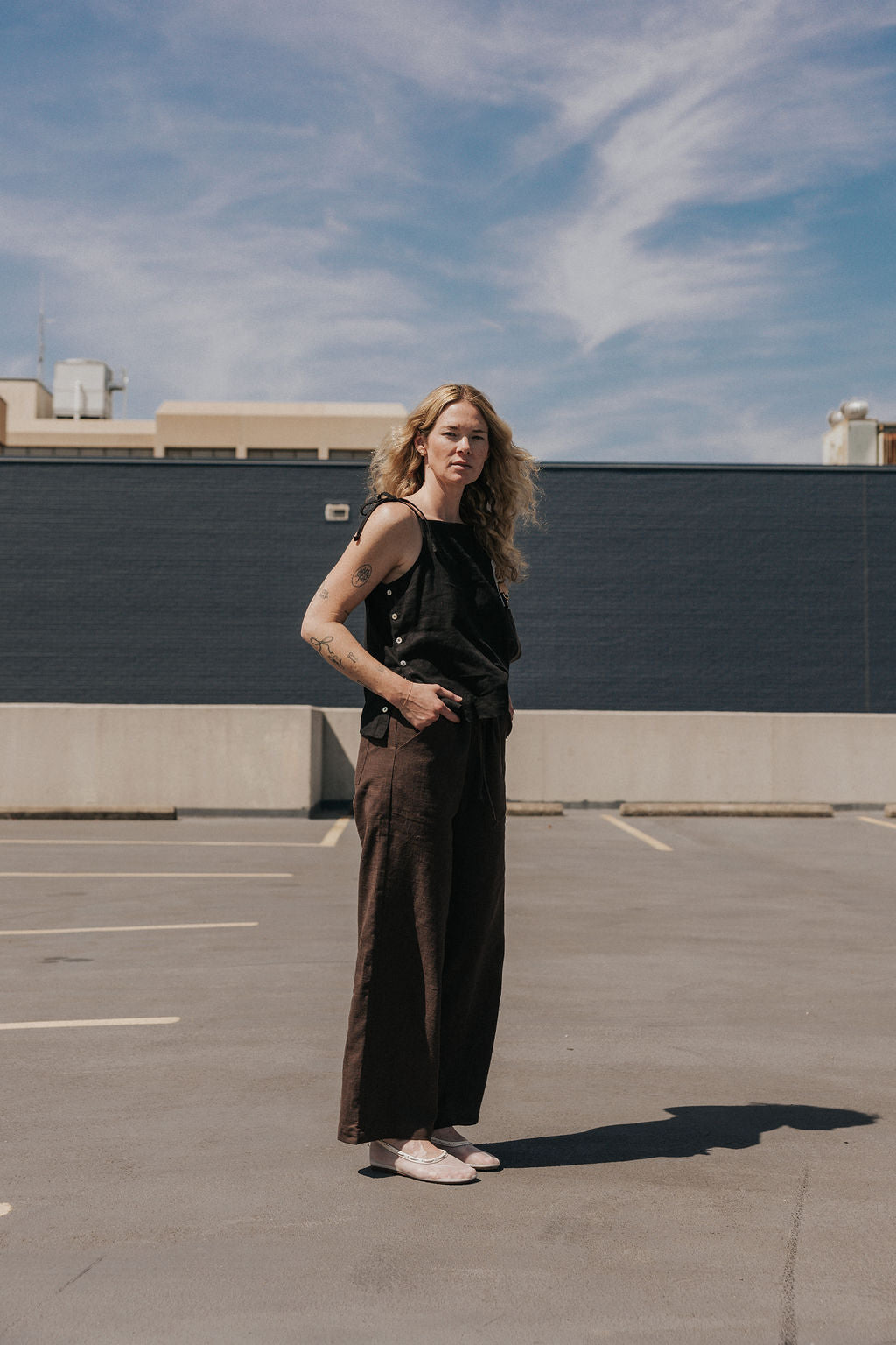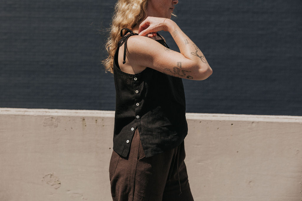 Made from airy linen that will move with you, the Lottie Tie tank is your new summer go-to. adjustable tie straps and agoya shell buttons on one side make this tank versatile and unique.