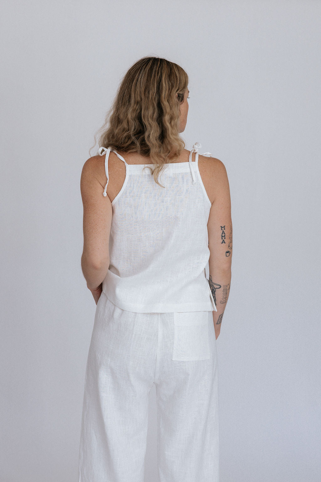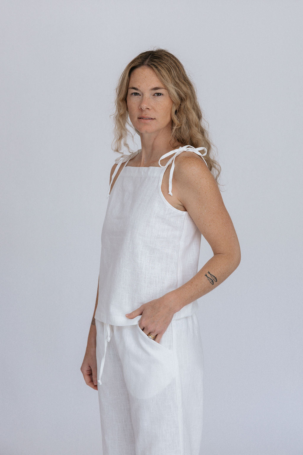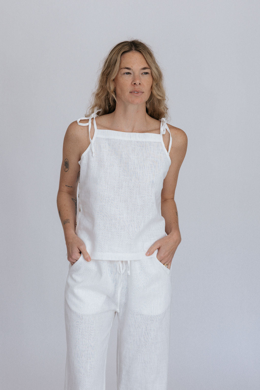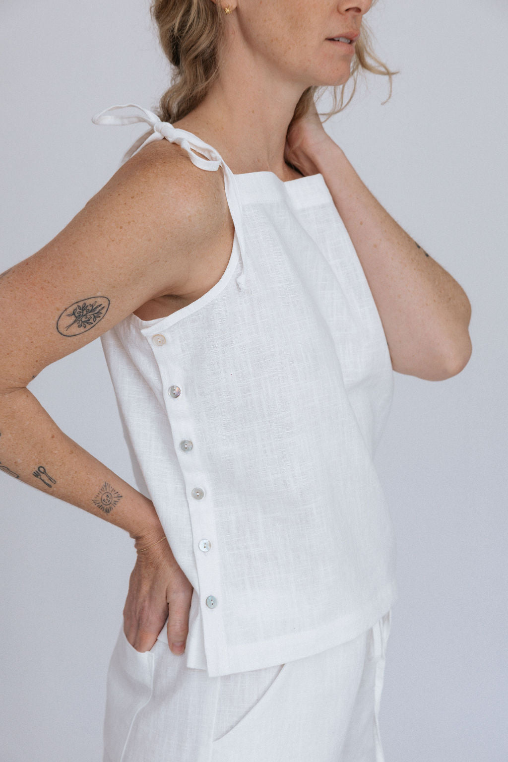 Made from airy linen that will move with you, the Lottie Tie tank is your new summer go-to. adjustable tie straps and agoya shell buttons on one side make this tank versatile and unique.