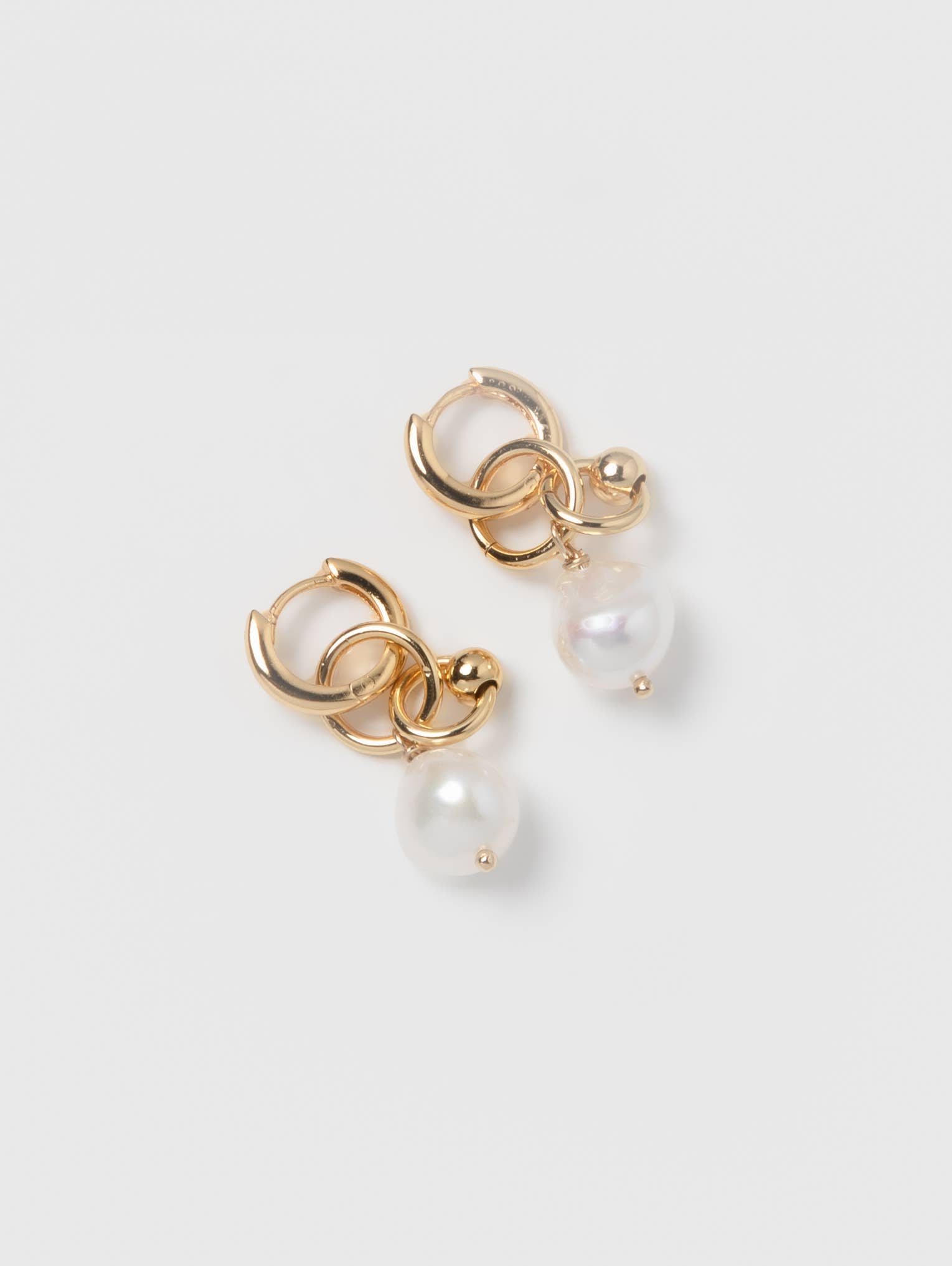 • 14k Gold plated brass huggie hoop earrings with freshwater pearl charms and 14k gold plated brass hinges