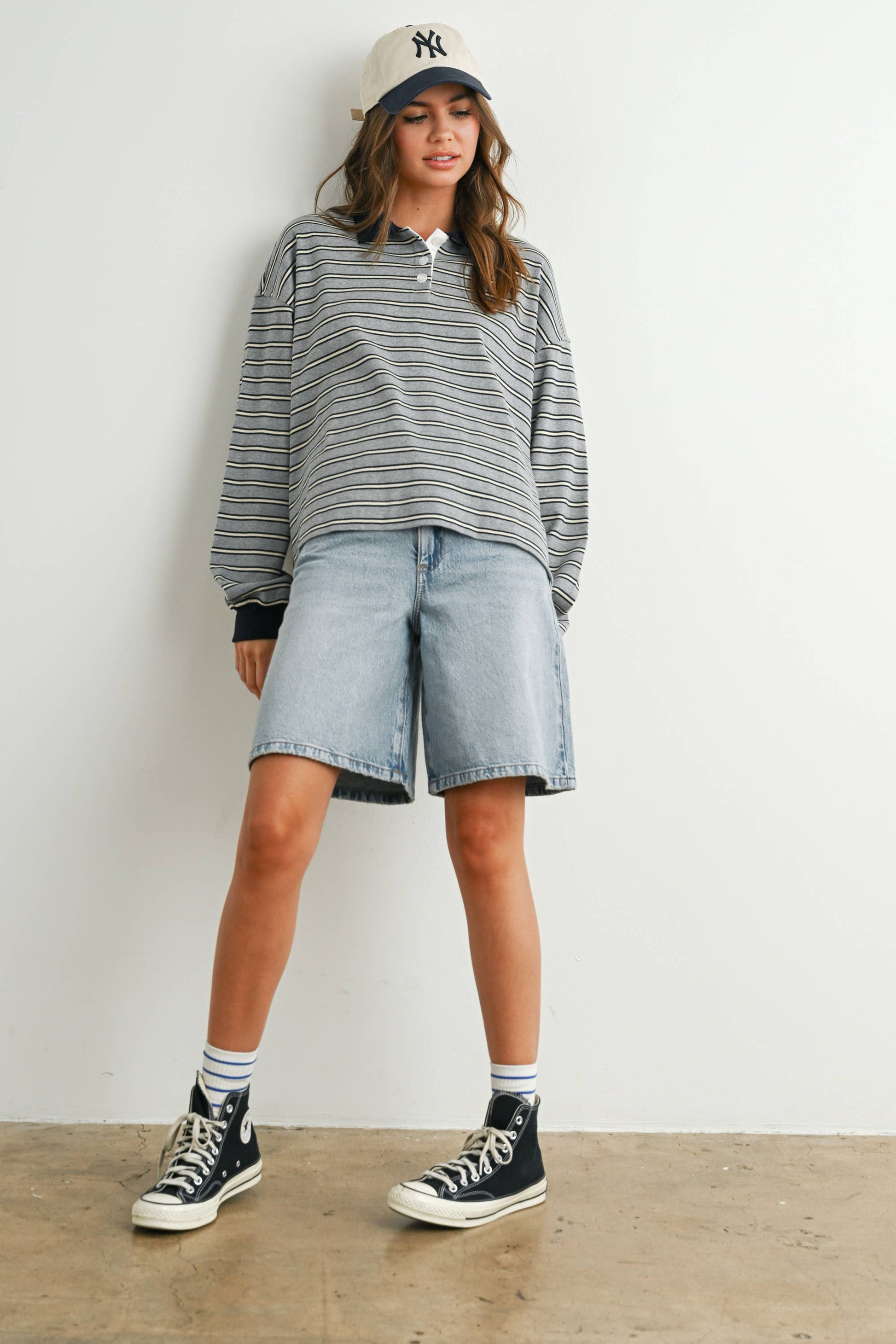 Classic and comfortable, this quarter-button striped collared long sleeve top brings timeless style to your everyday wardrobe. Featuring a smart collar, partial button-front detail, and a relaxed striped pattern, it's perfect for casual days or laid-back outings. Pair it with jeans or trousers for an effortlessly polished look.