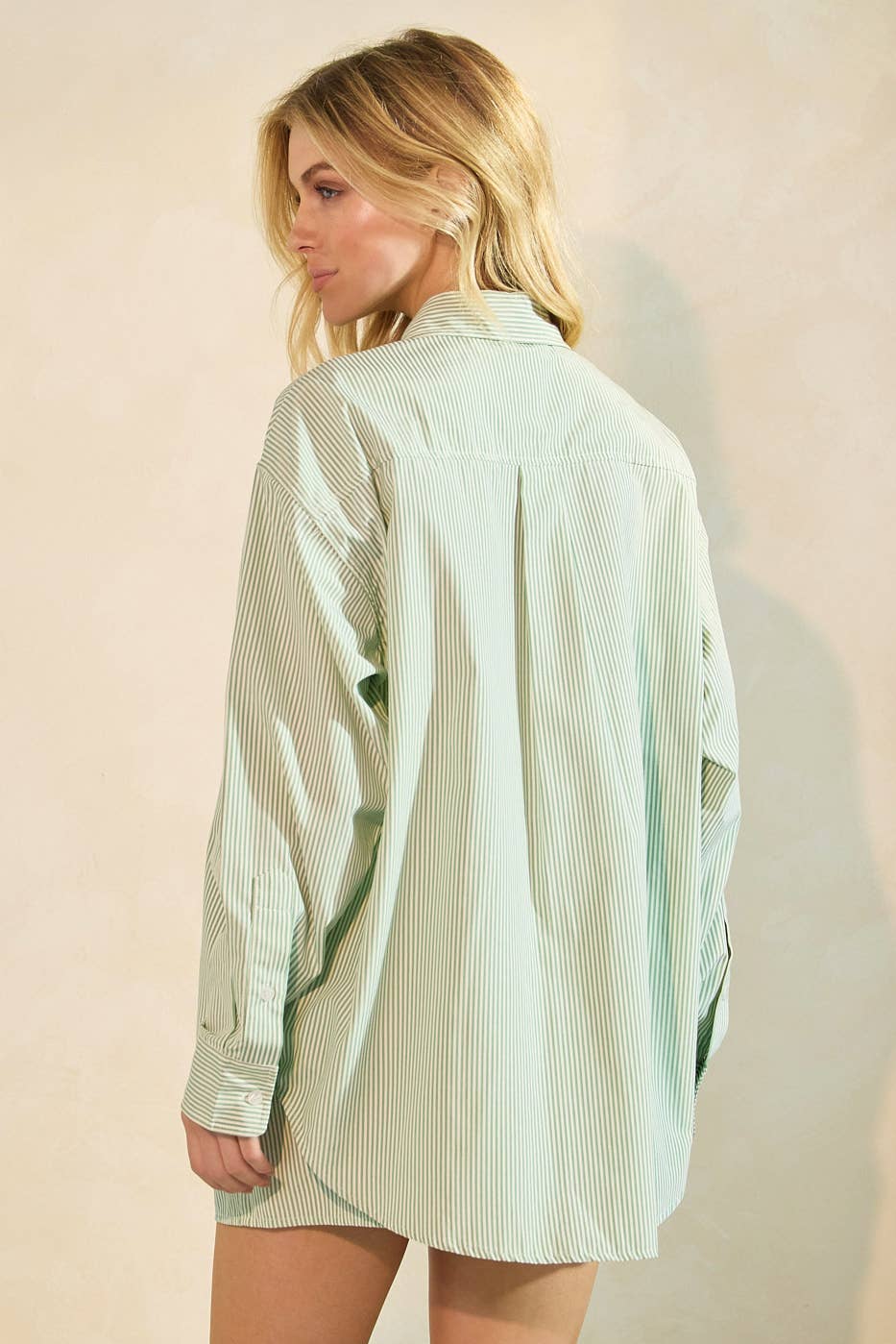 This set includes a striped woven top and matching shorts designed for comfort and style. The top features a relaxed drop shoulder, long sleeves with cuff bands, a button-front placket, and a single pocket detail. The shorts have an elastic covered waistband with a spaghetti tie for an adjustable fit. Perfect for casual days, this coordinated outfit combines ease and chic effortlessly. The model is 5'9" and wears a size small.