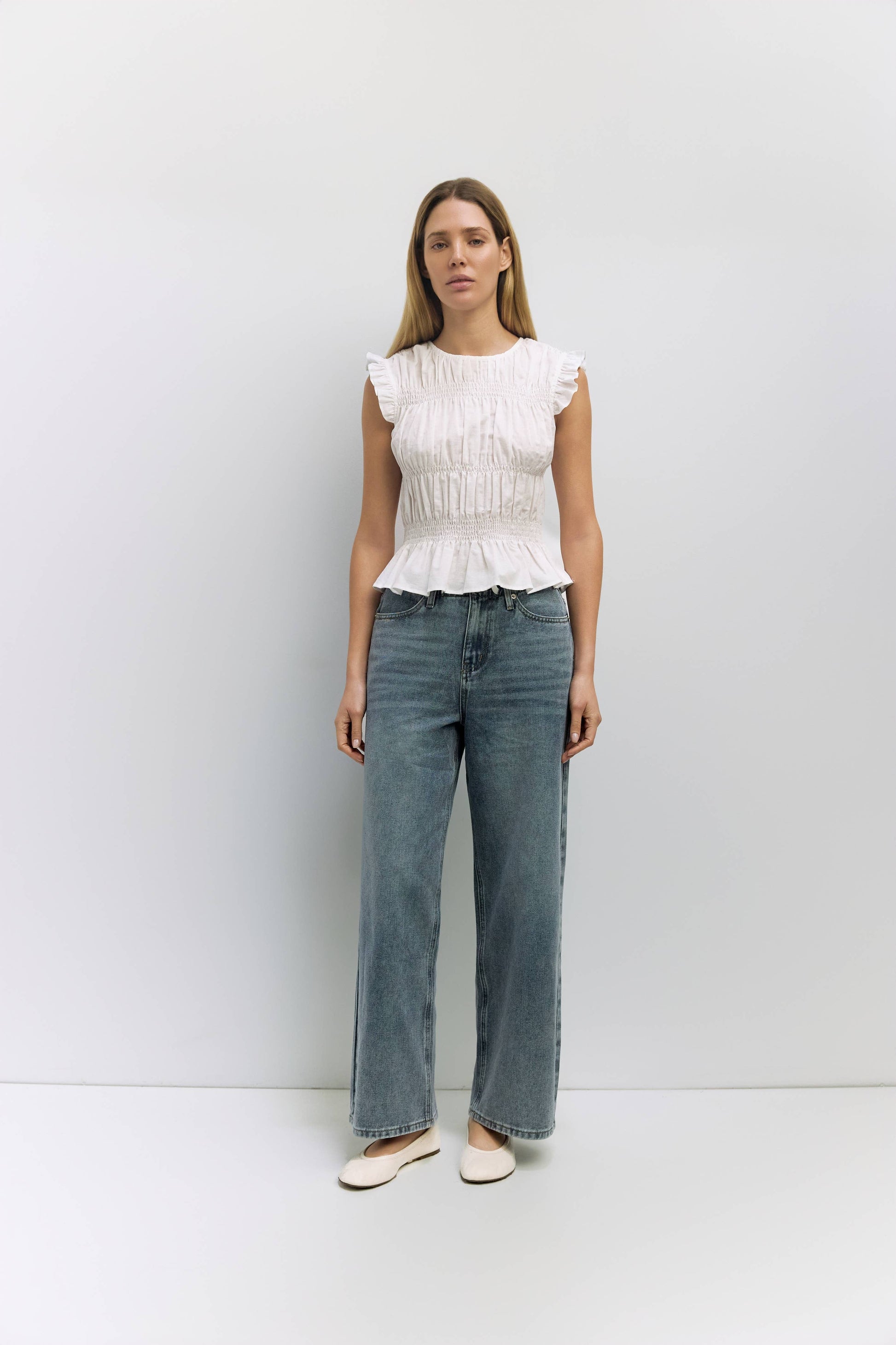 The Eugenie Top is a midweight smocked sleeveless blouse with subtle ruffles and a crewneck that is complemented by a partial back closure for a flattering shape.