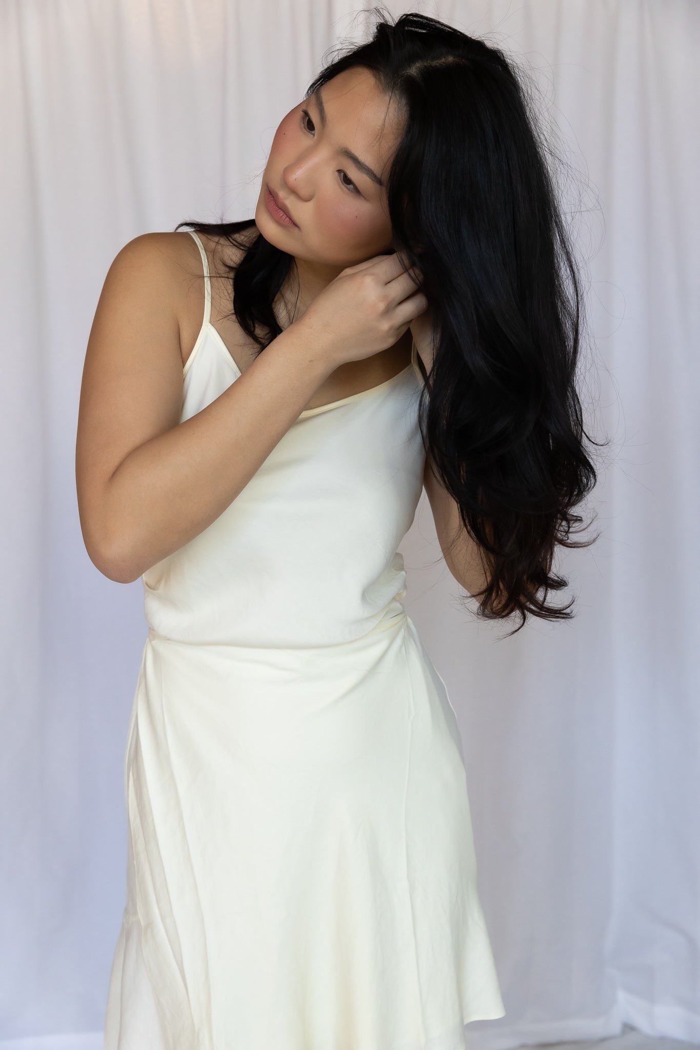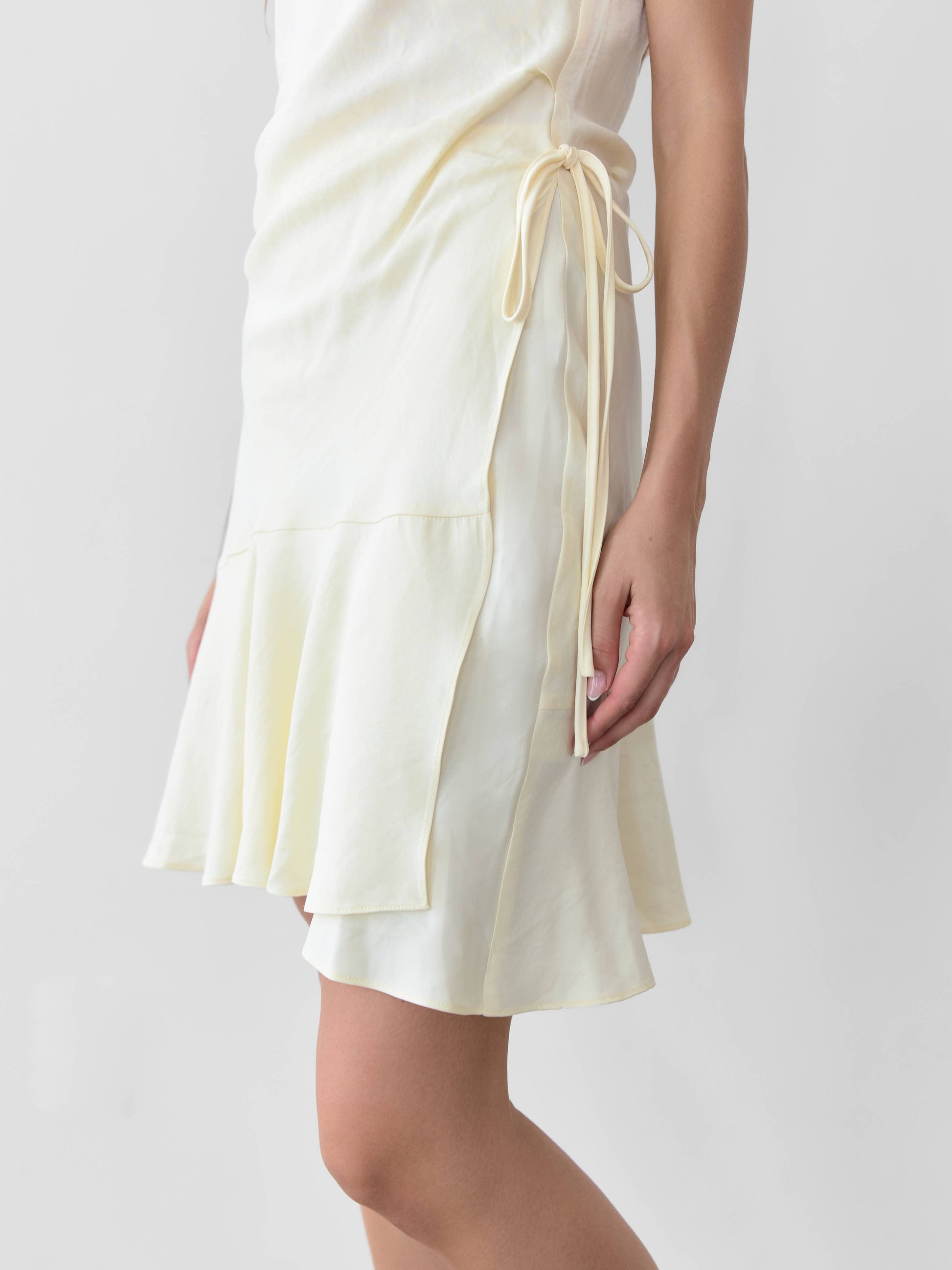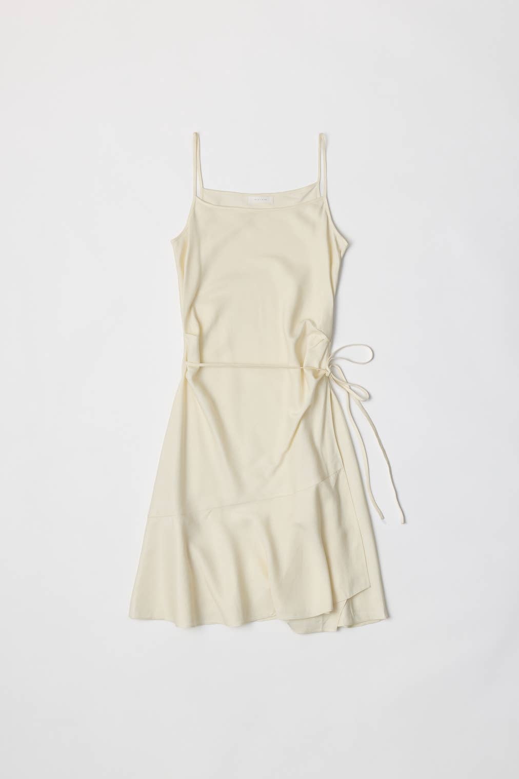 The Jolie Dress is a faux wrap dress crafted with a luxurious brushed satin fabrication, featuring a unique flared hem and chic side ties for a flattering silhouette.