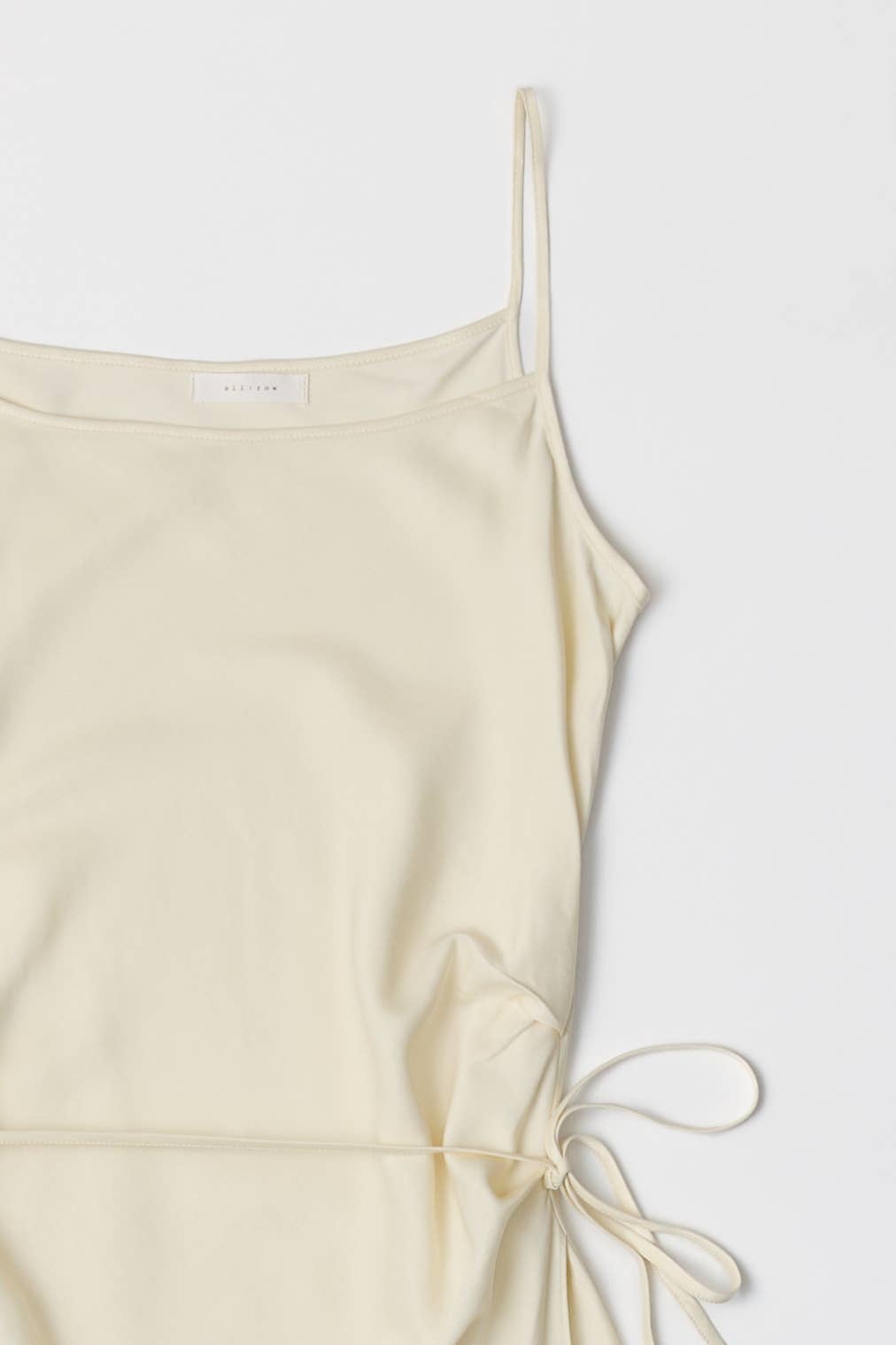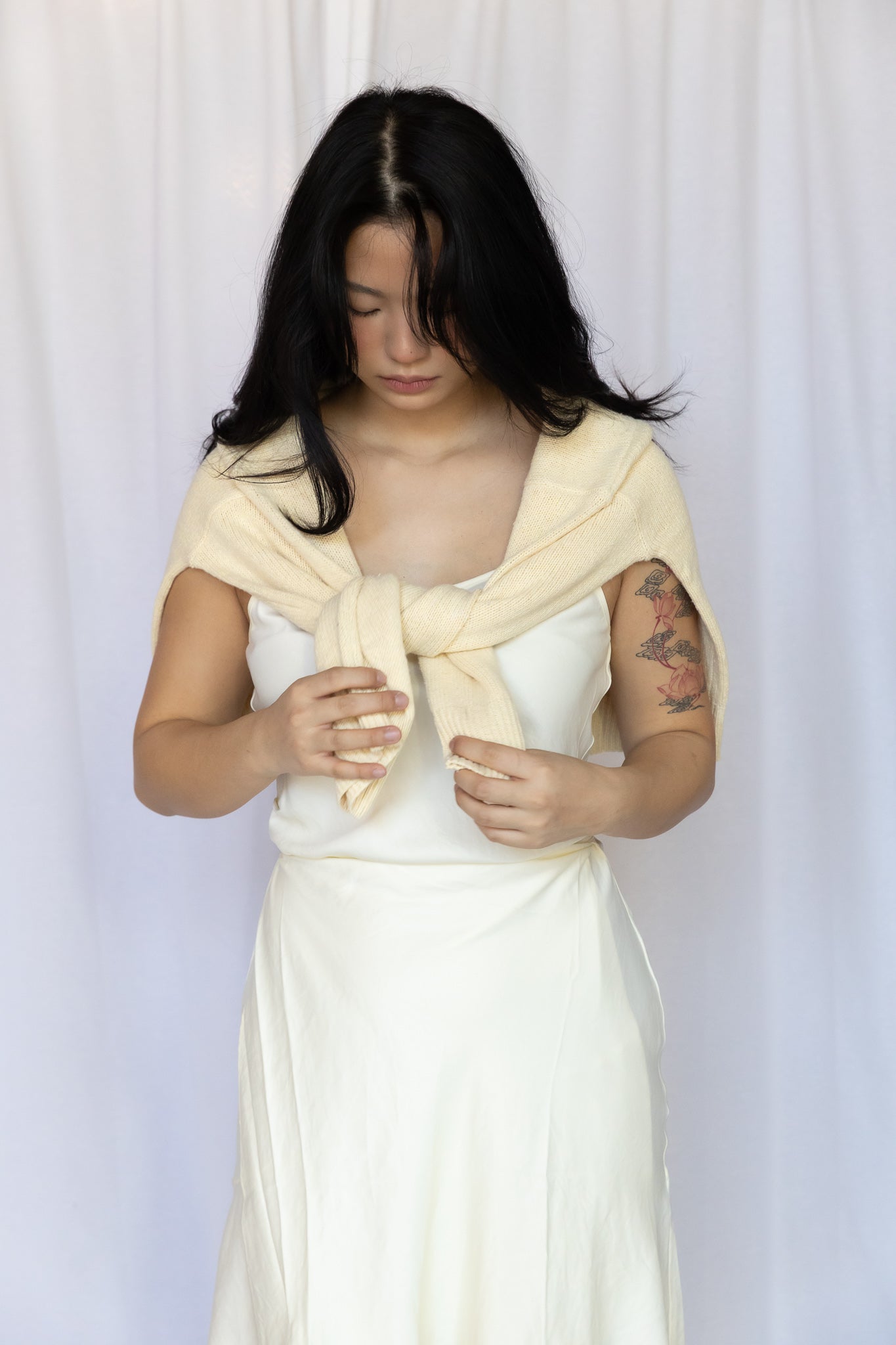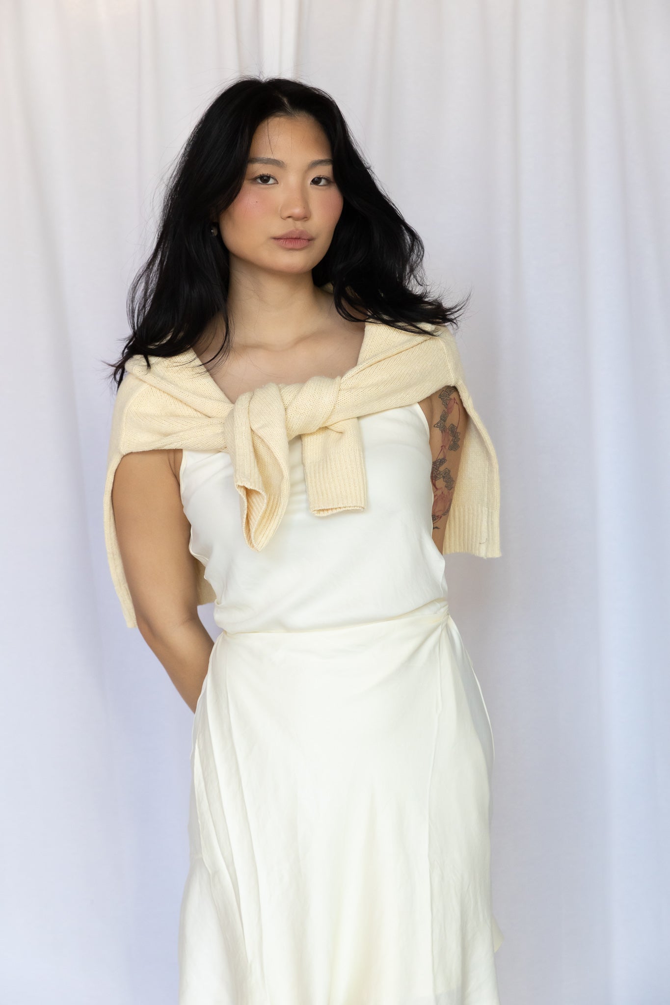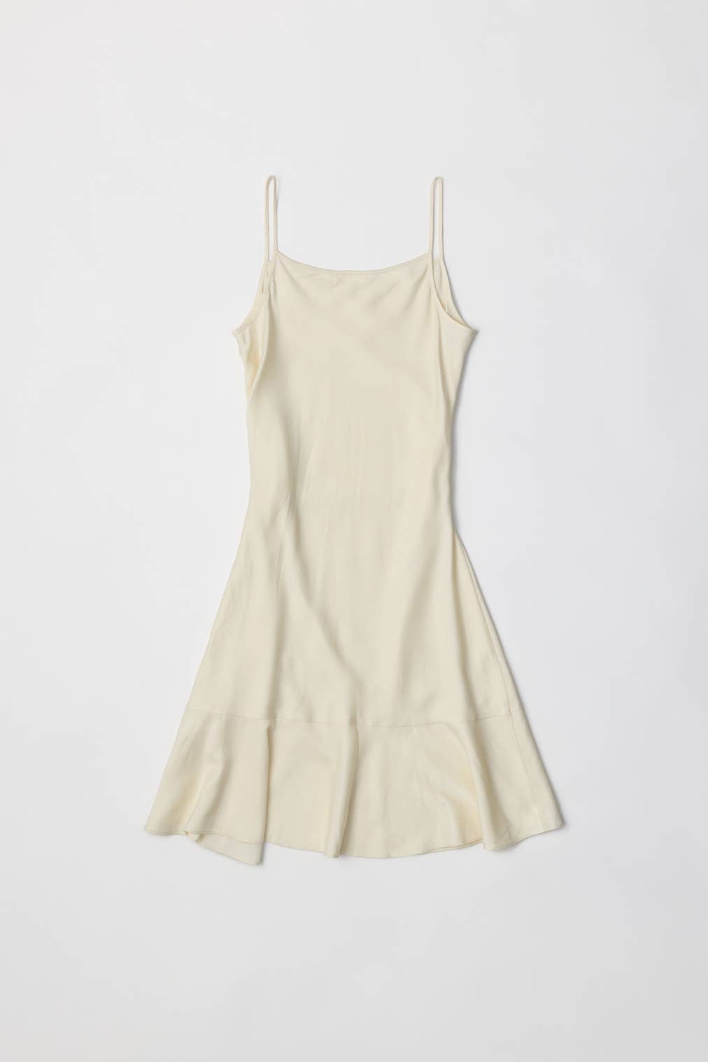 The Jolie Dress is a faux wrap dress crafted with a luxurious brushed satin fabrication, featuring a unique flared hem and chic side ties for a flattering silhouette.