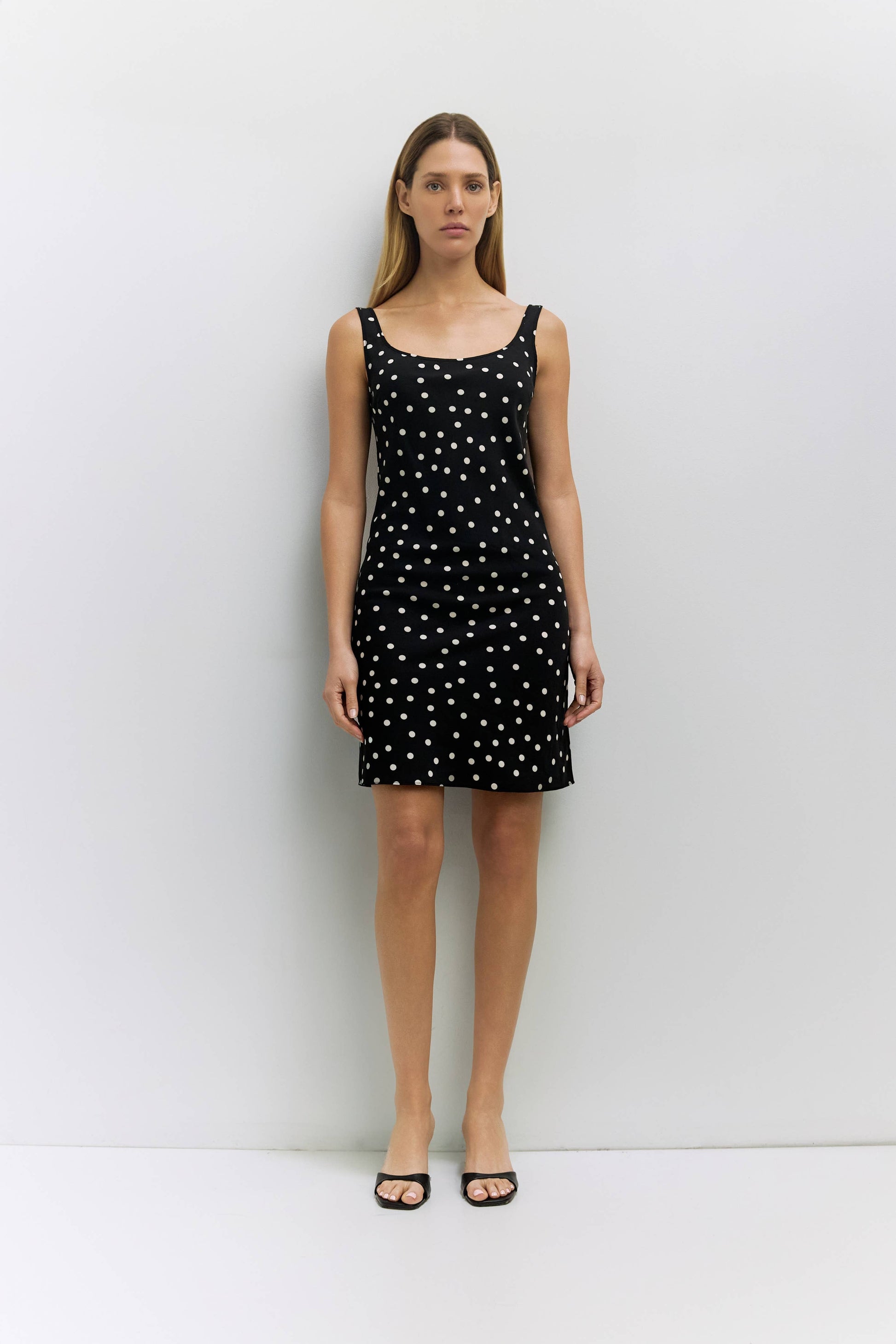The Kelly Dress is crafted from satin with a relaxed, sleeveless midi-length silhouette. It features a wide scoop neckline and a side invisible zipper for partial closure.